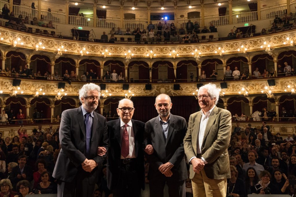 Uno dopo l’altro, gli ospiti del palco del Petruzzelli hanno avuto parole di ammirazione per il Maestro anche per i 90 anni compiuti il 10 novembre scorso. Particolarmente toccanti quelle di Nicola Piovani che ha osservato come la parola Maestro sottintenda “due accezioni. Quella legata alla tradizione artigianale, dal momento che la parola origina dal mestiere nei cantieri e quella riservata ai poeti. Morricone contempla entrambe le accezioni. E voglio qui ricordare come alla composizione di musica per il cinema egli abbia sempre affiancato la produzione di quella che lui chiama la ‘musica assoluta’, ovvero la musica da concerto. Noi tutti compositori dobbiamo moltissimo a Ennio Morricone: prima di lui la colonna sonora, pur composta da eccellenti autori, non veniva quasi considerata ma lui è riuscito, per primo, a dare smalto e visibilità al nostro lavoro. Tutta l’Italia gli deve molto: l’Italia di Giotto e di Dante Alighieri è anche l’Italia di Ennio Morricone!”